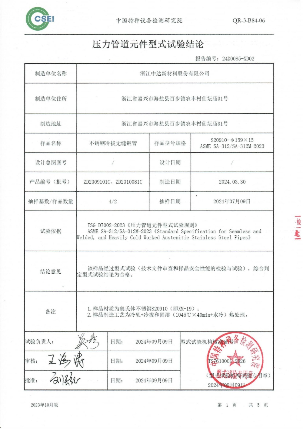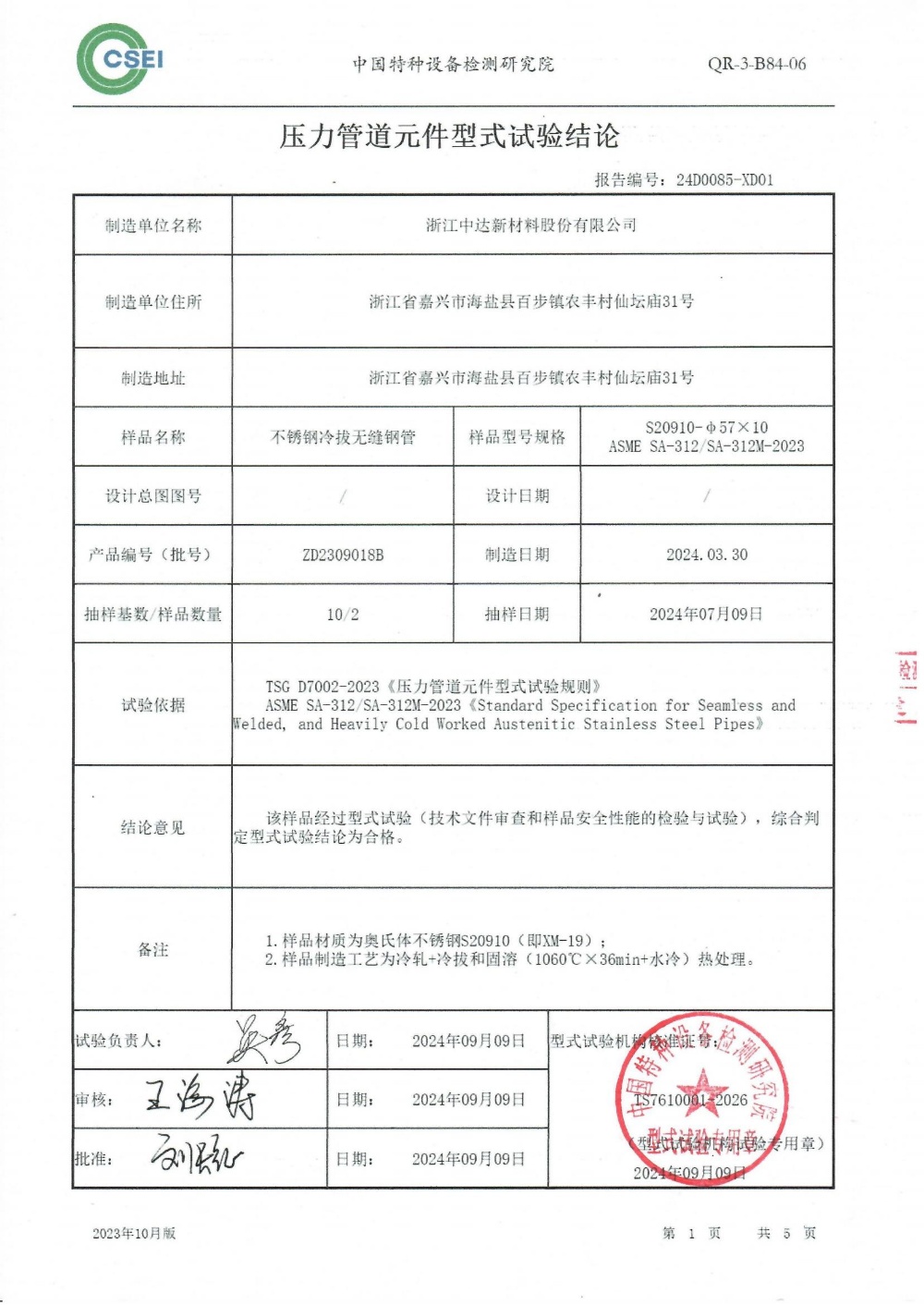 型式試驗是在中達新材質量檢驗與試驗合格的基礎上,由承擔型式試驗工作的中國特種設備檢測研究院,對新材制造的XM-19無縫鋼管產品是否符合安全技術規范而進行的技術資料審查、安全性能檢驗與試驗,驗證出廠產品安全可靠的活動。通過型式實驗所拿到的證書,不單單是對新材創新的新產品認證,更表示公司已具備生產此類鋼種規格的能力。