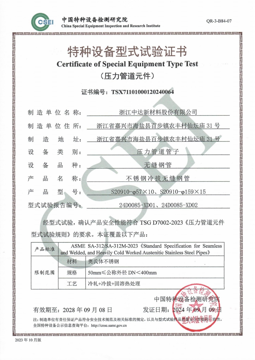 祝賀中達新材獲得壓力管道元件特種設備型式試驗證書